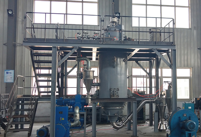 本設(shè)備由熔煉保溫室、霧化室、充氣系統(tǒng)、旋風(fēng)除塵器、收粉罐、真空系統(tǒng)、充氣系統(tǒng)、水冷系統(tǒng)、液壓系統(tǒng)、電源及電控系統(tǒng)、工作平臺等組成。本設(shè)備為立式高架結(jié)構(gòu),地面布置有充氣系統(tǒng),真空機(jī)組和收粉罐。